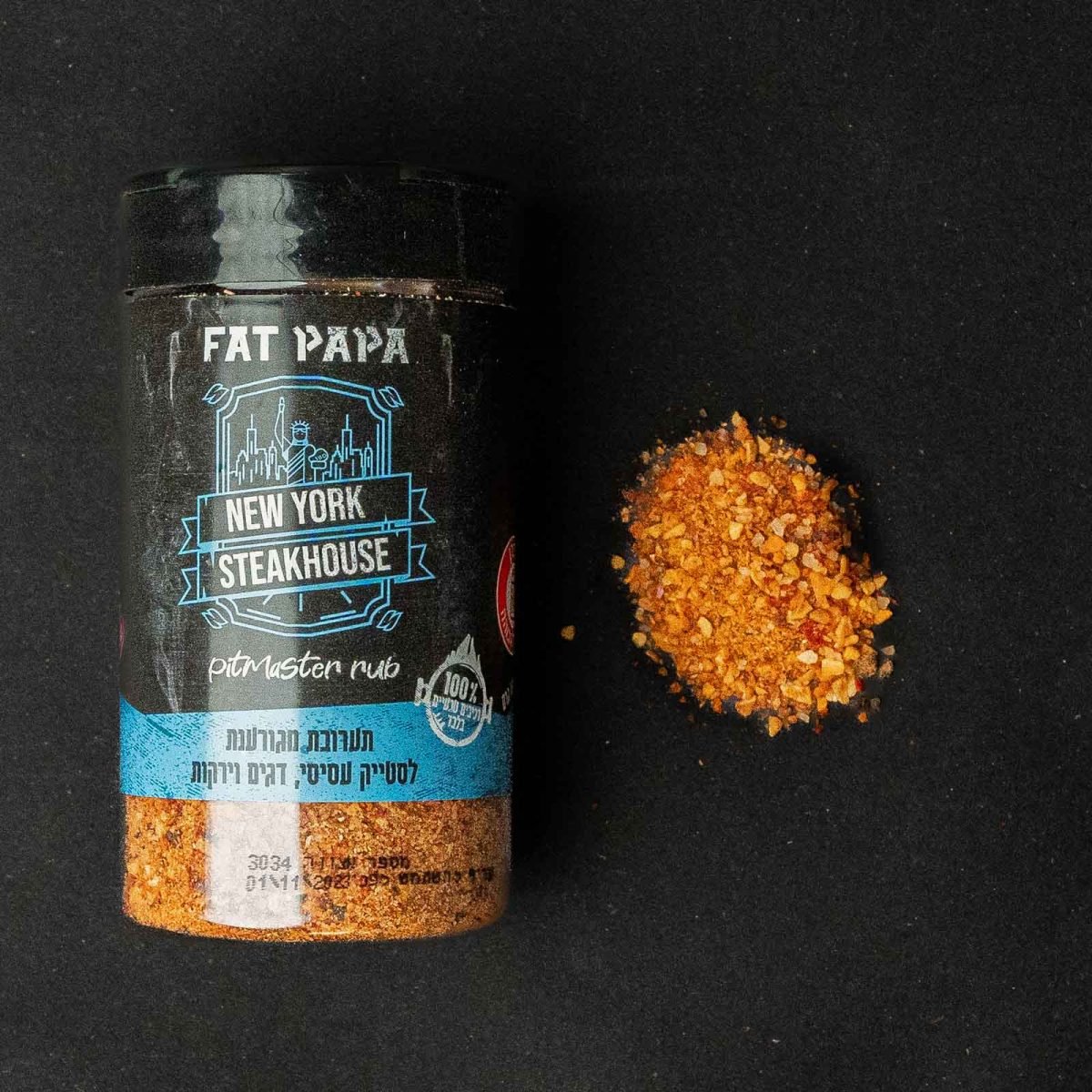 ראב ניו יורק סטייק האוס מבית Fat Papa, תערובת תבלינים עדינה ומאוזנת במרקם קראנצ'י המדגישה את איכות חומרי הגלם של המנה. ומעניקה חיזוק לטעמים שלפני או אחרי הצלייה בצורה מדויקת. בשילוב של מלח הימלאיה ופלפל 4 עונות גרוס עם שום מתקתק בשמן זית ועוד. מתאימה לנתח סטייק עסיסי, דגים, פוטטוס וירקות בתנור ומעולה לתיבול נתח בסו-ויד.